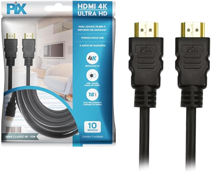 O Cabo HDMI 4K 60Hz da Pix, com 10 metros, garante uma experiência de áudio e vídeo de alta qualidade. Em conformidade total com o padrão HDMI 2.0, ele oferece todos os recursos do padrão 1.4 e vai além.